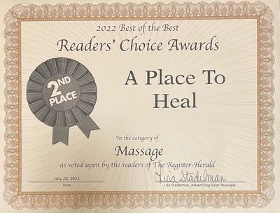 Based upon votes received from readers of the Register Herald, A Place to Heal, Inc. was honored with a 2nd Place Readers' Choice Award in the category of Massage. We would like to extend a personal thank you to everyone who took the time and effort to vote!
